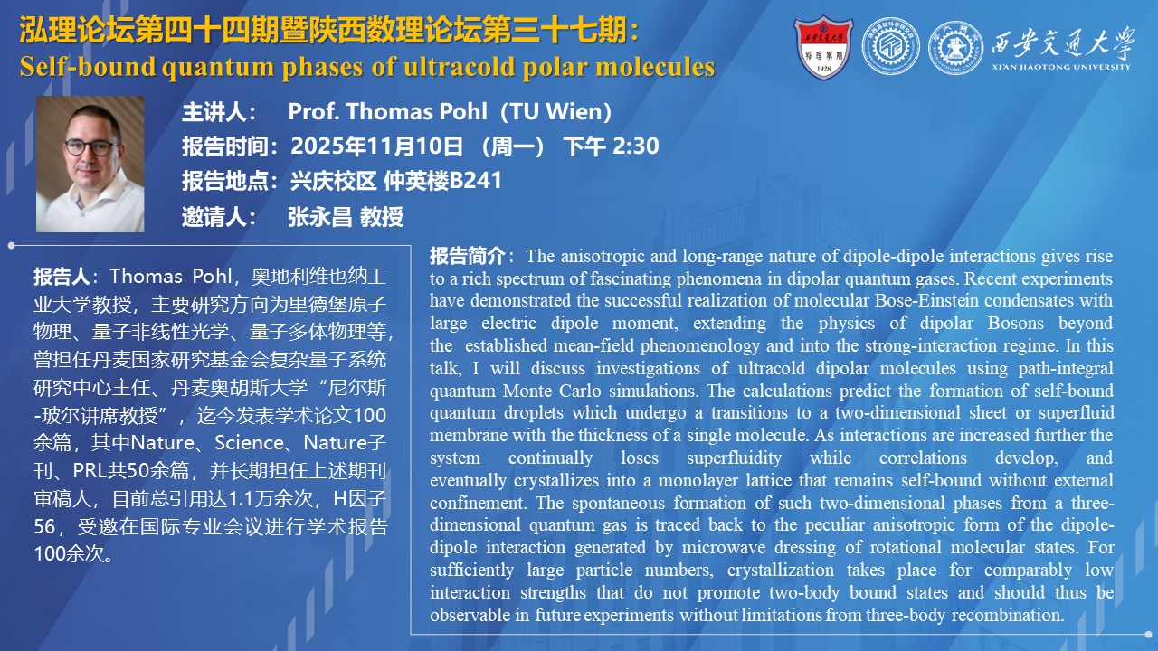 【泓理论坛第四十四期暨陕西数理论坛第三十七期】—— Self-bound quantum phases of ultracold polar molecules