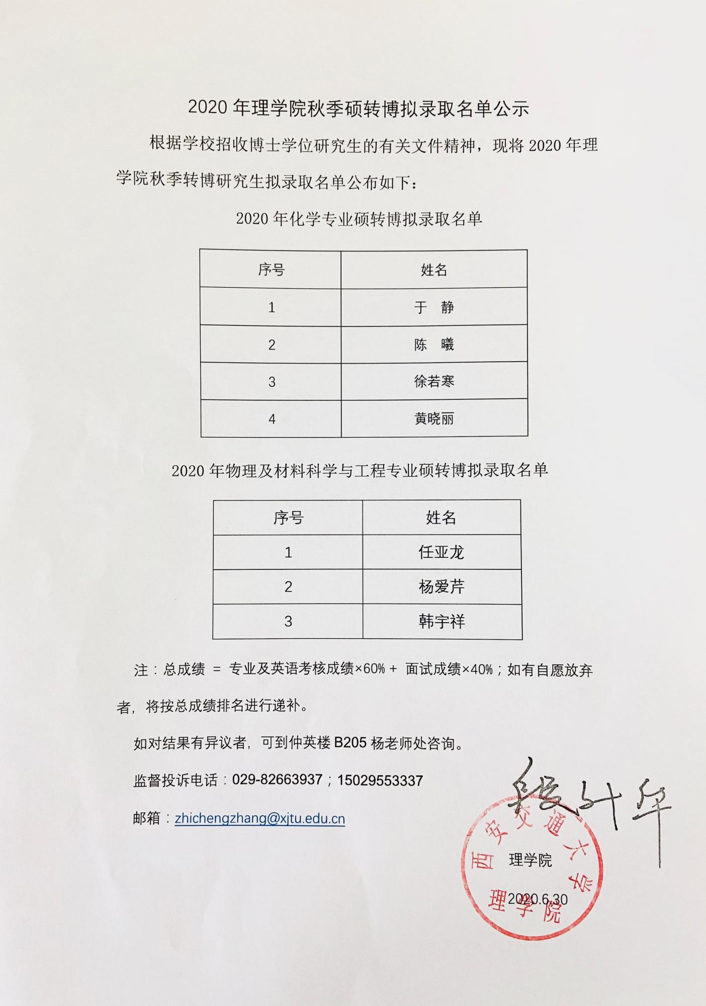 2020年理学院秋季硕转博拟录取名单公示