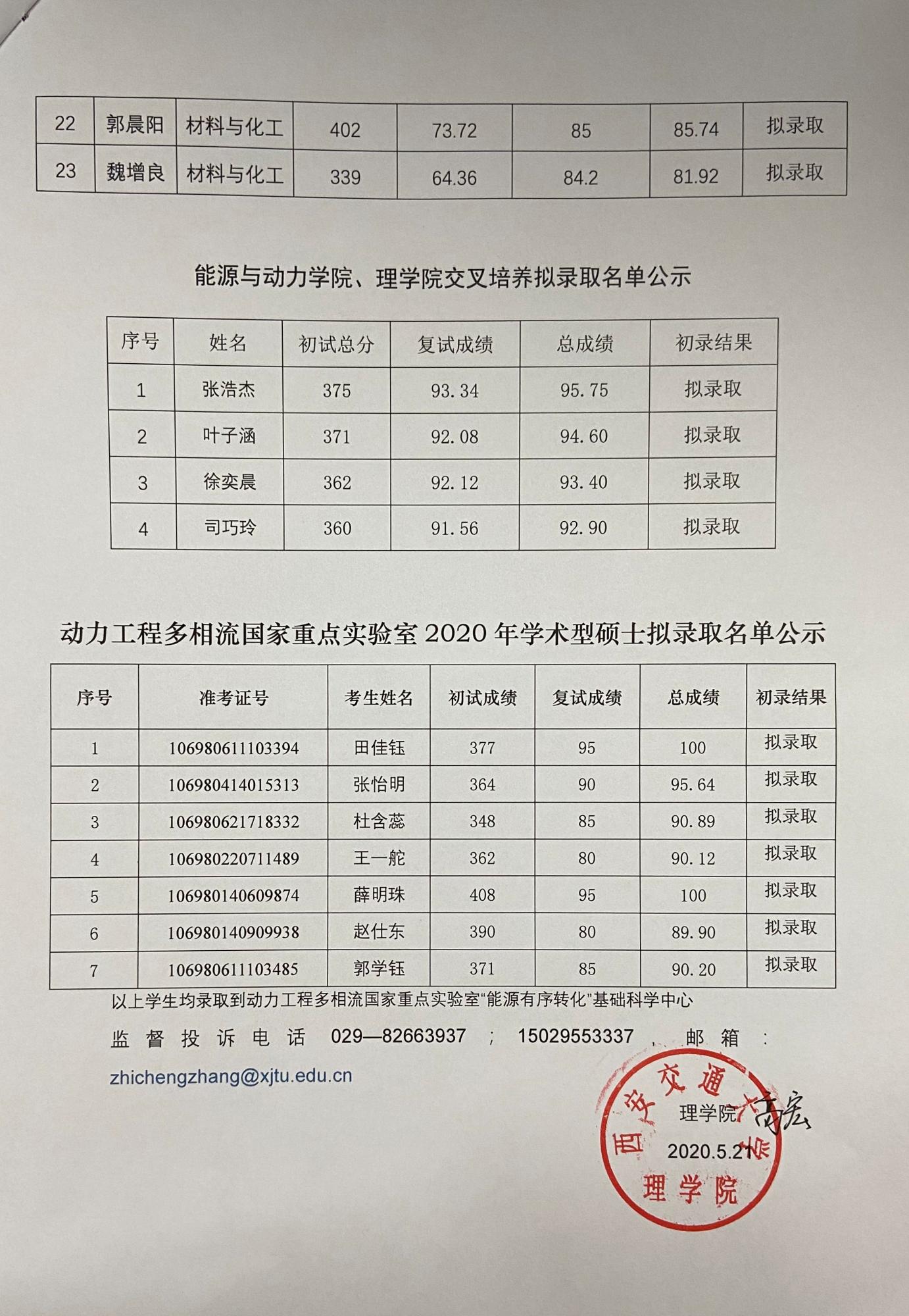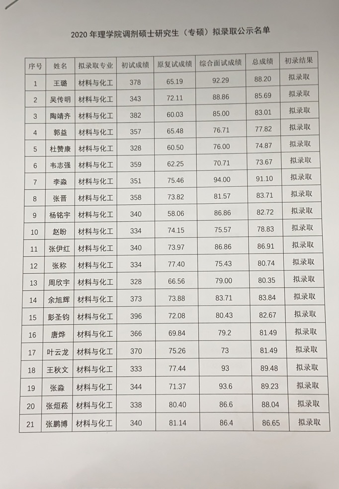2020年理学院硕士研究生材料与化工(专硕)补录取公示名单