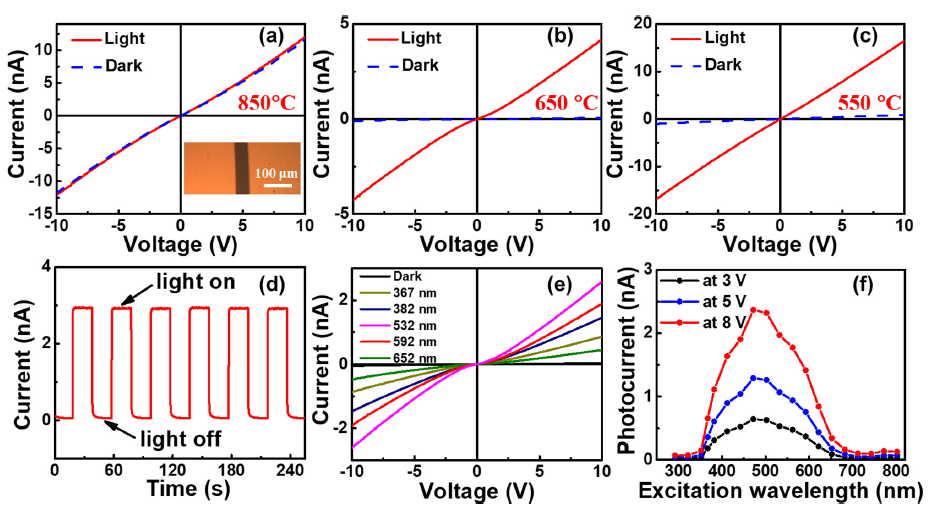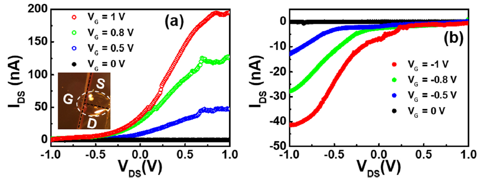 杨森教授团队与纽约州立大学布法罗分校曾浩教授团队合作,在500 ℃下成功合成了 薄膜以及相关光电探测器和场效应晶体管。该薄膜表面粗糙度仅为0.6 nm,且去除了高温处理带来的的硫空位和碳污染。以其为核心材料的光电探测器显示出了极快的光电响应速度(0.3 ms)和较高的开/关比(80)。场效应晶体管表现出双极性行为,其中电子和空穴迁移率分别为16.8 / Vs和2.6 / Vs,这些都为硫族化物钙钛矿薄膜在光电器件中的进一步应用打下了坚实的基础。