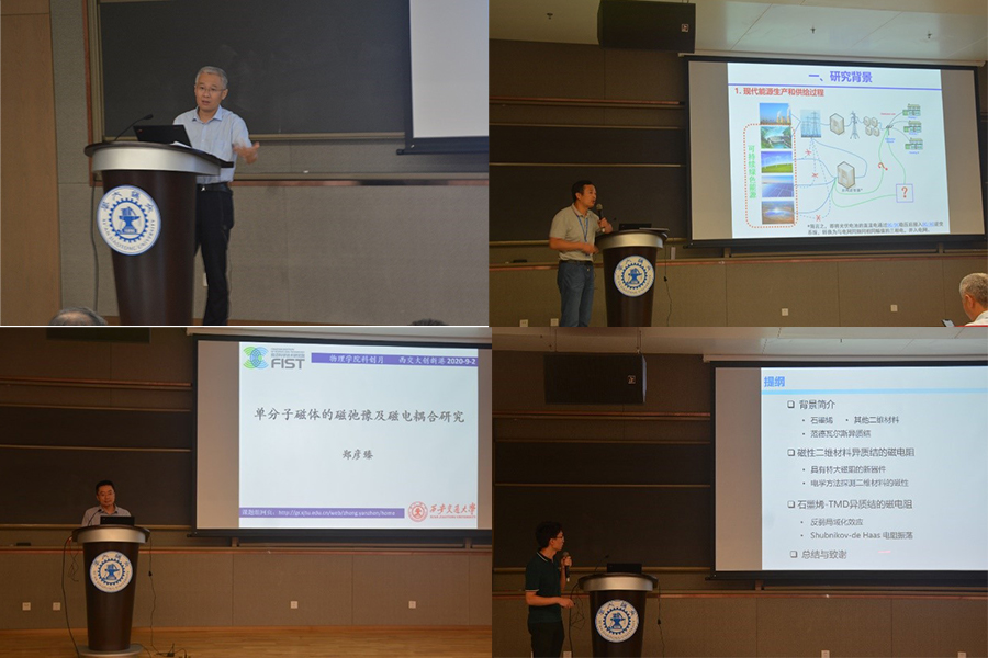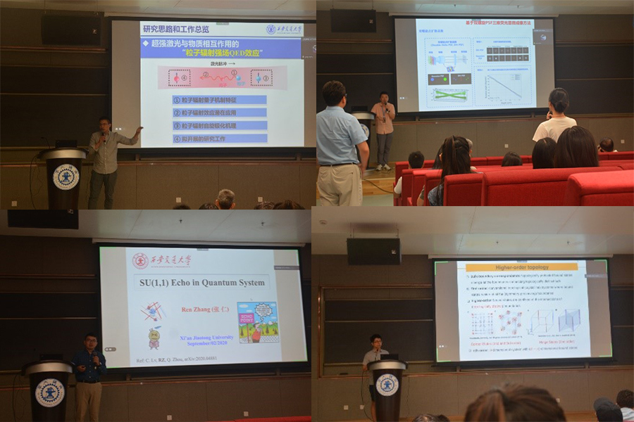 栗建兴、雷铭、张仁、朱晓宇、杨森、杨生春、郑彦臻、王喆和王文慧等老师围绕《强激光驱动的QED效应及其应用》、《基于空间光场调控的光学微操纵技术》、《SU(1,1)Echoin Quantum System》、《高阶拓扑超导体》、《铁电/铁磁材料的奇异结构(构型)与性能》、《光电解水催化材料结构设计及性能研究》、《单分子磁体的磁弛豫及磁电耦合研究》、《二维材料的电学输运特性》和《表面等离激元的传输特性及能量损耗研究》等研究方向的前沿科学问题,带来8场学术报告,深入浅出的介绍了课题的研究意义、研究内容、研究结果以及未来的应用。在场师生认真聆听,在交流互动环节,踊跃发言提问,气氛轻松热烈,让广大师生感受到了学术的魅力。