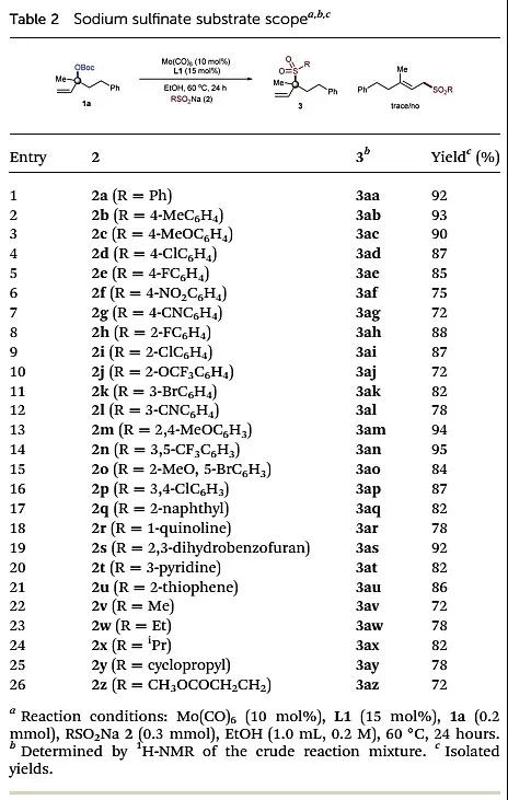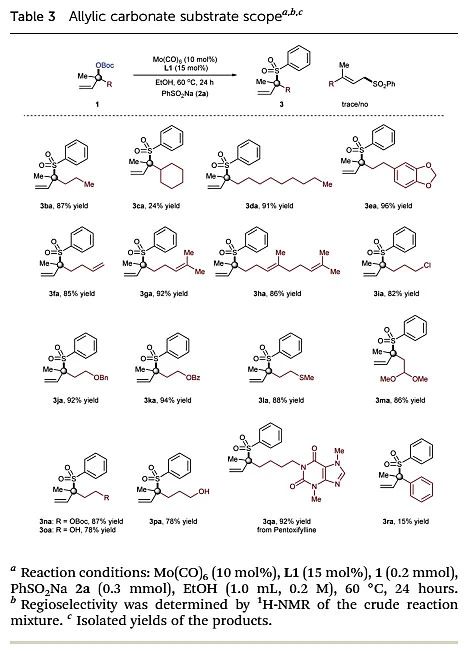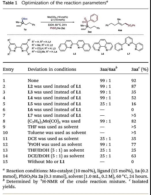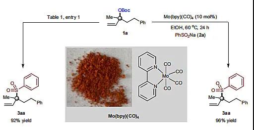 具体探索过程如图4。该团队以叔烯丙基碳酸酯1a与苯亚磺酸钠2a为底物,Mo(CO)6为催化剂,2,2’-联吡啶为配体,EtOH为溶剂,在60 ℃下反应24 h即可获得高产率及高区域选择性的目标产物。