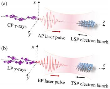 图1利用非线性康普顿散射产生圆偏振(Circularly-polarized, CP)和线偏振(Linearly-polarized, LP)伽马射线的示意图。(a)任意偏振(Arbitrarily-polarized, AP)激光脉冲和纵向自旋极化(Longitudinally spin-polarized, LSP)电子束对撞,可以产生圆偏振伽马射线。(b)椭圆偏振(Elliptically-polarized, EP)激光脉冲可以将横向自旋极化(Transversely spin-polarized, TSP)电子束在激光短轴方向分裂成两部分,并且这两部分可以分别辐射出高偏振度的线偏振伽马射线。