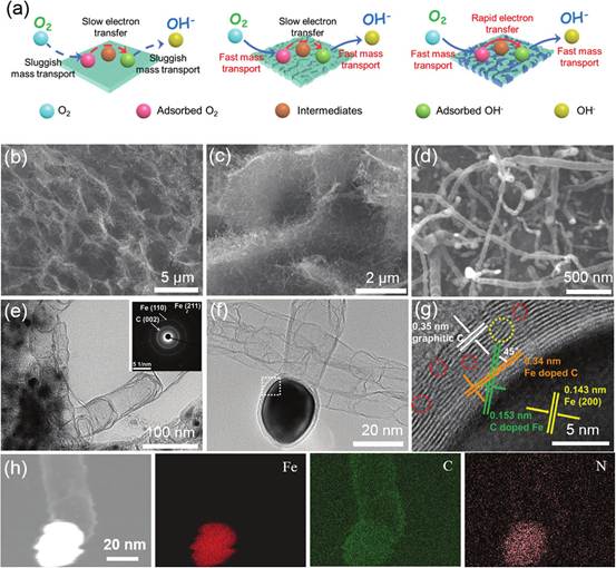 理学院丁书江教授、肖春辉副教授课题组通过界面调控和结构设计制备了类水母状的Mott-Schottky催化剂,该催化剂可以促进ORR过程中的电子转移和质量传递。由于Mott-Schottky效应,电子在Fe和N掺杂的石墨化碳(NG)界面上重新分布,提高了催化位点的活性,有效促进电荷转移。半封闭的空腔结构和触手状的碳纳米管(CNTs)增强了活性物质和活性位点的碰撞,分层级的多孔结构提高了ORR过程中的质量传递。该工作加深了对ORR过程中电子转移和质量传递重要性的理解,并为构建高效的Mott-Schottky催化剂构建了新的途径。