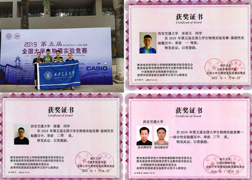 在学院和物理学科的统一安排和大力支持下,针对本次竞赛,今年3月初选拔我院物理试验班四名本科生组成了我校代表队,理学院实验物理教学中心组成的指导教师团队与参赛队的几位同学利用课余时间,投入大量精力对基础性实验和综合设计性实验的理论背景和实验技能进行了系统梳理和实际操作。通过系统训练,竞赛中几位参赛同学以严谨的科学态度、深厚的理论功底、扎实的实验技术获得优异成绩。其中,宋昊天同学(物试72)获得全国一等奖,陈震同学(物试72)获得全国二等奖,袁识博同学(物试61)和张钧翔同学(物试62)获得全国三等奖,我校代表队整体表现在参赛高校中名列前茅。