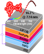 目前,可见光有机发光二极管(OLED)技术已经开始逐步走进人们的生活,在信息显示如手机屏幕、电视屏幕以及发光照明如室内照明、汽车尾灯等应用场景中不断提高人们的应用体验与生活品质。因为近红外光在光治疗、生物成像、通信以及夜视显示等方面具有特殊应用,在可见光OLED快速发展的过程中,最大发射峰波长超过700 nm的近红外OLED也越来越受到人们的关注。然而,绝大部分近红外OLED的发光外量子效率都低于10%。这是受制于能隙规则(energy gap law)以及传统的近红外材料合成方法复杂低效,高性能近红外发光材料非常稀少导致的。因此,开发高性能近红外发光材料依然是该领域的一个重大挑战。