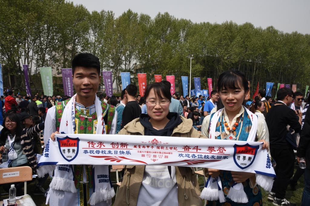 参加本次大会的理学院教师代表40余人,学生代表共计105人,由理学院各个年级的硕士和博士代表组成,尤其值得一提的是在众多学生代表中,有两位少数民族同学也踊跃报名,热情参与,来自硕3046班的藏族姑娘郭虹和来自博1513的苗族小伙赵江身着自己民族的盛装,用自己民族特有的方式祝贺母校生日快乐,成为理学院参会代表的一道亮丽风景线。