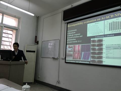 张建祥教授首先介绍了当前缓控释材料及靶向释药系统的研究进展及其在临床转化方面所面临的主要瓶颈问题。在此基础上,重点报告了其团队近年来在病灶微环境响应性载体材料及其纳米释药系统方面所开展的主要工作。其中主要包括:1)微酸性pH响应性环糊精载体材料的合成及其纳米载体在小分子药物、多肽及核酸类药物胞内递送与靶向治疗工作;2)活性氧响应性材料的合成及其体内外相容性评价;3)pH响应性和活性氧响应性纳米药物在结肠炎、动脉粥样硬化和血管再狭窄等炎症相关疾病靶向治疗中的应用。最后与参会的老师和学生就相关研究及其转化进行了深入探讨和交流。