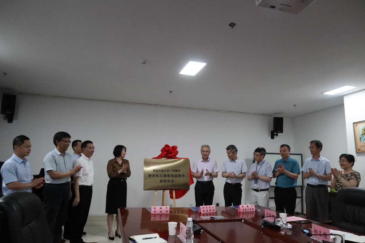 仪式上,杨帆、高宏、曾君为三方代表为产学研合作中心签约,杨森、曾君共同为“西安交大-常德市新材料与智能制造联合研究中心”揭牌。