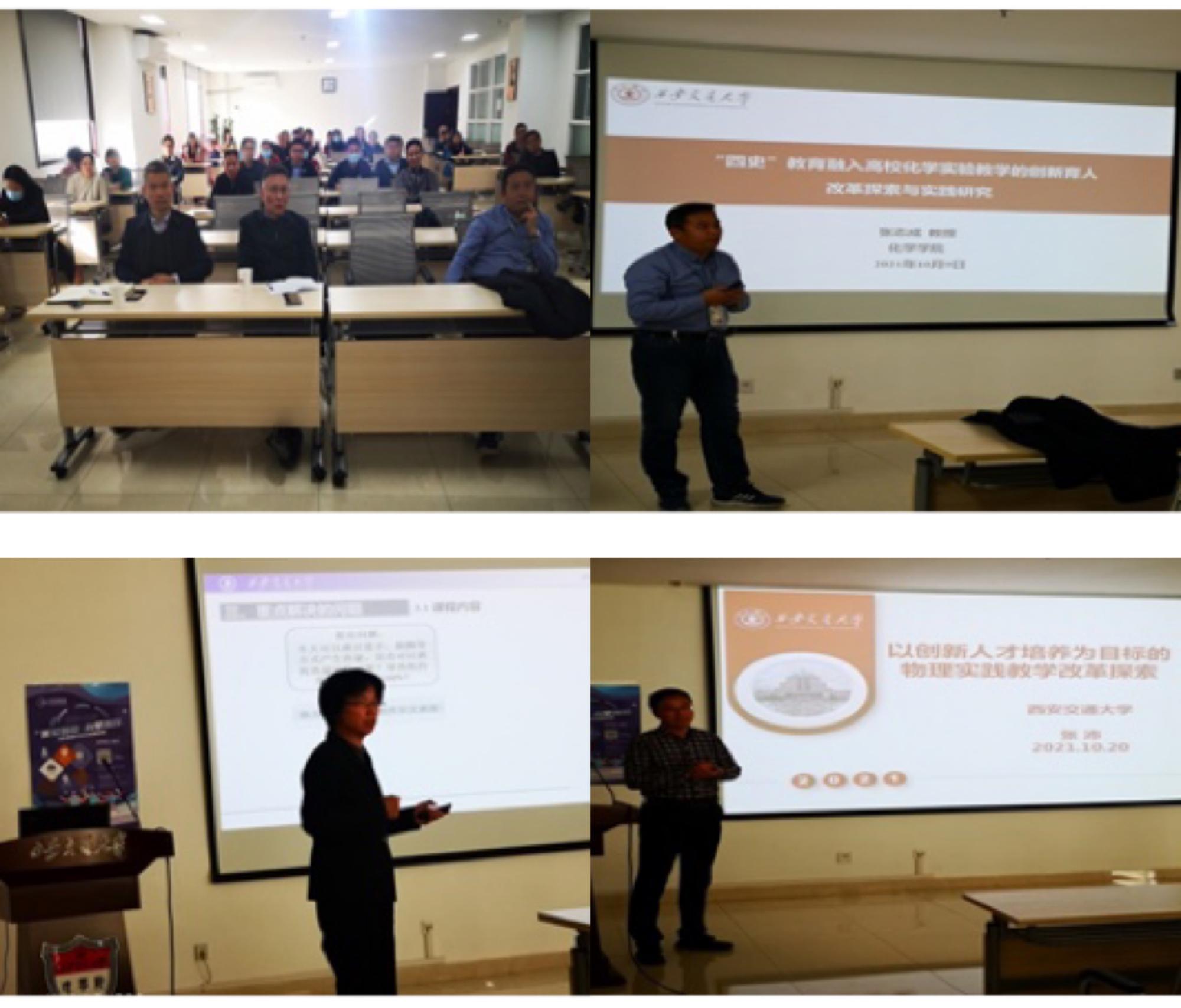 张志成老师介绍了他们将“四史”-即党史、新中国史、社会主义史、改革开放史融入化学实验教学中的做法,这种新颖的课程思政观点使大家深受启发;方爱平老师介绍了他们教学团队对热学课程的建设历程以及在教学中采取的开放互动式教学模式,良好的教学效果及学生高度认可的评价让大家印象深刻;张沛老师介绍了物理国家级实验教学示范中心在多层次实验室建设、思政实验室建设、虚拟仿真实验室建设、科普实验室建设等多方面取得的成绩,让大家深受鼓舞;胡敏老师介绍了她们在化学课程教学中采取的多种教学模式,深受学生好评,取得了良好的教学效果;张雯老师介绍了他们在通识类课程《化学与人类文明》中如何融入课程思政,以及多个教学案例,使大家深受启发;夏明岗老师介绍了他们教学团队在物理实践课程中采取的新模式,以及这种模式如何解决了理论与实际脱节的问题,使学生被动学习变为主动获取知识,提高了学生的学习兴趣,是一种非常好的教学尝试;赵述敏老师介绍了多年来物理实验中心在历届全国物理实验竞赛、物理学术竞赛等活动中取得的优异成绩,以及如何在全国竞赛中培养学生的创新能力,如何通过竞赛活动来提高教师的教学水平,受到大家肯定。