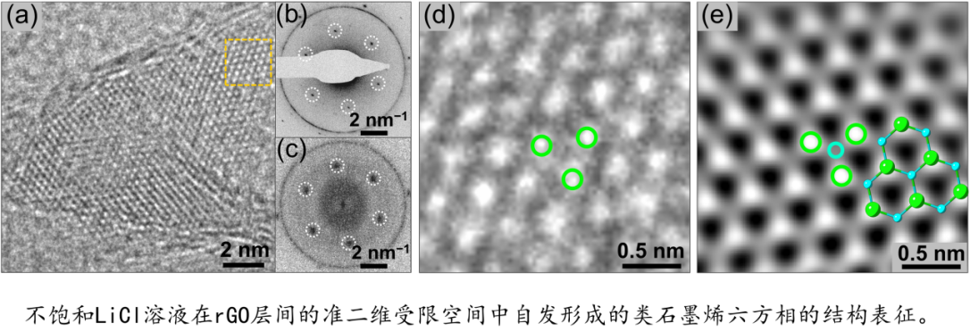 在相同的实验参数下,科研人员同样观测到了在水环境中由不饱和LiCl溶液在rGO膜层间形成的类石墨烯六方相(h-LiCl),从而揭示了广泛存在于rGO层间的碱卤化物类石墨烯六方相的非经典成核途径,并讨论了这种新奇物相潜在的独特电子性质。结合对照实验、密度泛函理论(DFT)计算和以前的理论研究,溶质和rGO衬底之间的阳离子-π相互作用、阴阳离子之间的静电相互作用、溶质-溶剂相互作用和受限空间中热力学之间的微妙平衡协同导致了这种六方晶相的形成。这些发现阐明了基底和受限空间对新奇物质相形成的影响,并为碱卤化物类石墨烯六方相的制备提供了一个通用方案。