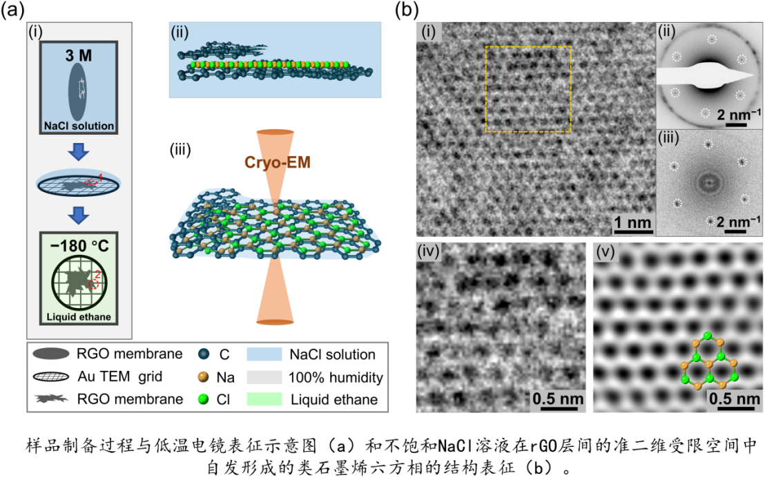 张磊教授和张胜利教授课题组以冷冻透射电镜技术为基础,结合多种实验和理论分析方法,报道了环境条件下在水环境中还原氧化石墨烯(rGO)层间的准二维受限空间中由不饱和NaCl溶液自发形成的稳定类石墨烯六方相(h-NaCl),并实现了对这种六方相的近原子分辨率观察和原位表征。这是环境条件下类石墨烯六方NaCl相独立且稳定存在的首个实验证据。