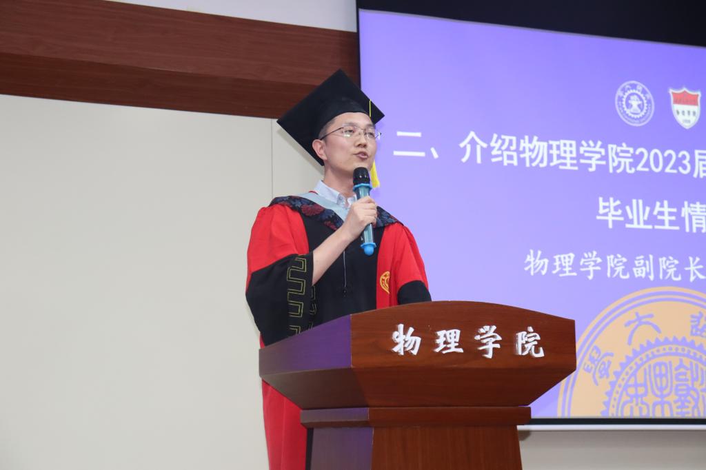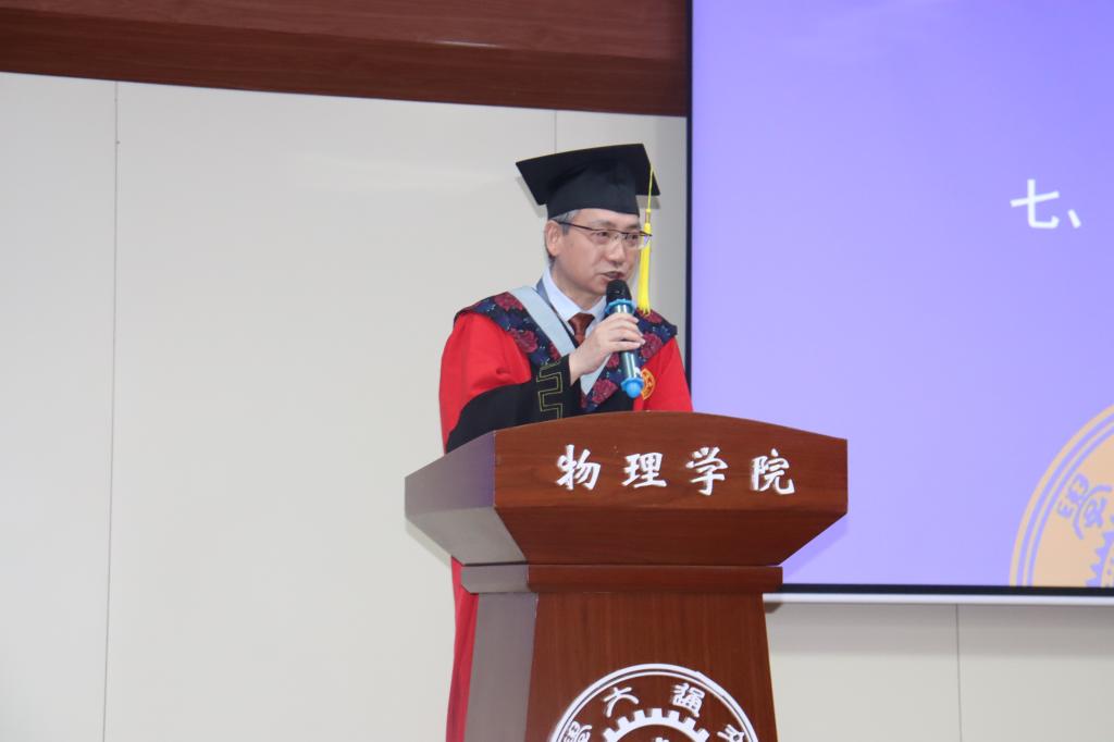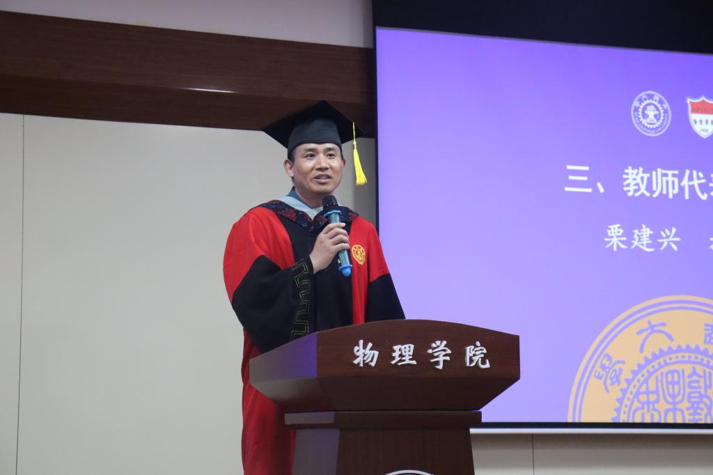 教师代表栗建兴教授谈到了自己的求学和科研经历,他以亲身经历告诉同学们做科研要保持认真、专注和严谨的心态,学会找到合适的方法缓解生活学习和科研工作中的压力。他最后以“路虽远,行则将至;事虽难,做则必成”勉励同学们,希望大家在科研或工作中持之以恒,走出自己的人生坦途。