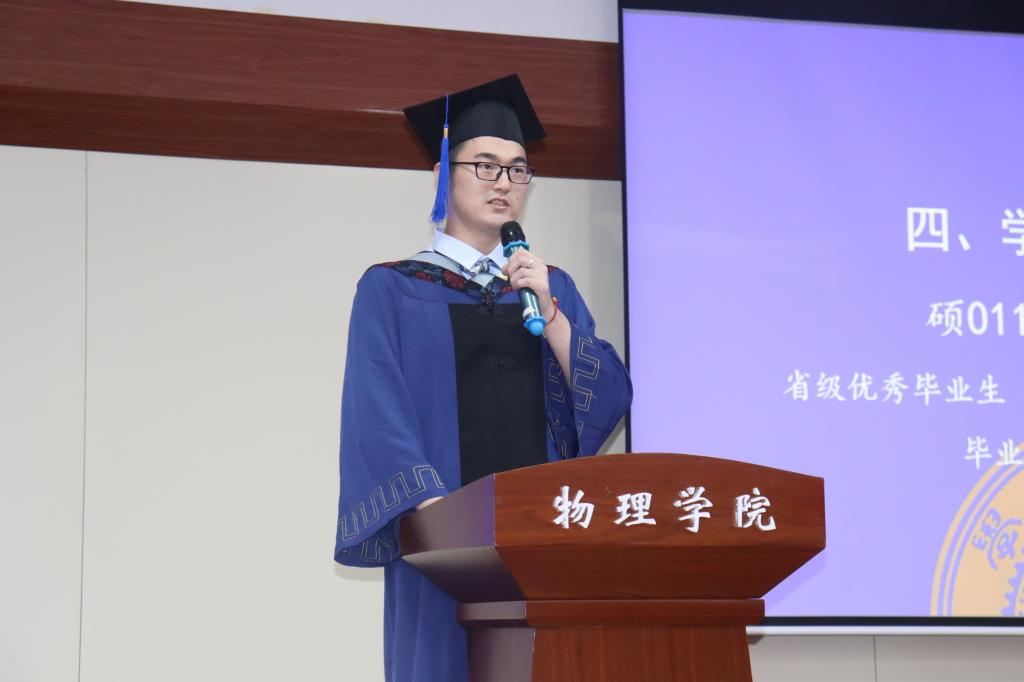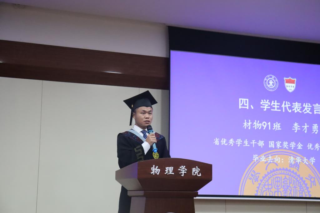 本科毕业生代表,省级优秀学生干部、校级优秀学生标兵获得者材物91班李才勇回忆大学生活的点点滴滴,表示在之后的生活中会一直铭记交大“精勤求学、敦笃励志、果毅力行、忠恕任事”的校训。研究生毕业生代表,省级优秀毕业生、校级优秀硕士生标兵获得者刘北辰分享了对交大深深的热爱与不舍,他鼓励同学们大胆尝试以找到自己擅长且喜欢的事业,在生活中劳逸结合以保持充沛的能量,时刻贴近前沿避免和社会信息脱节。最后他衷心祝愿同学们在自己认为正确且热爱的道路上继续奋力前进,实现自己的目标与理想!