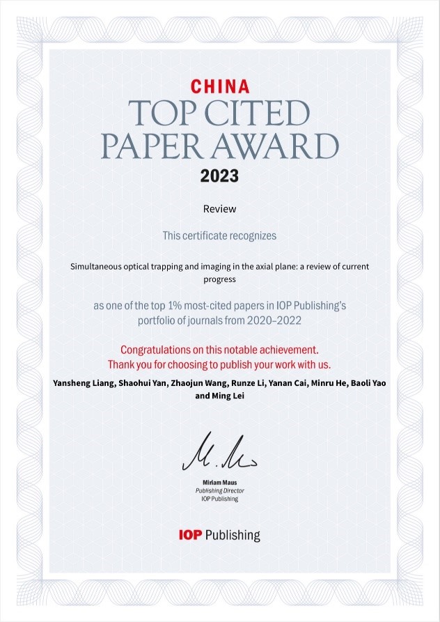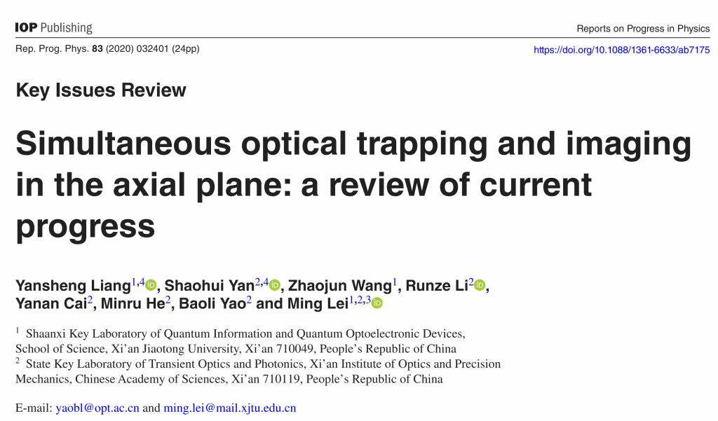 雷铭教授团队在Reports on Progress in Physics(IF=18.1)的综述论文“轴平面同时光学捕获与成像”(Simultaneous optical trapping and imaging in the axial plane: a review of current progress)获得IOP Publishing的前1%高被引荣誉。四虎影院