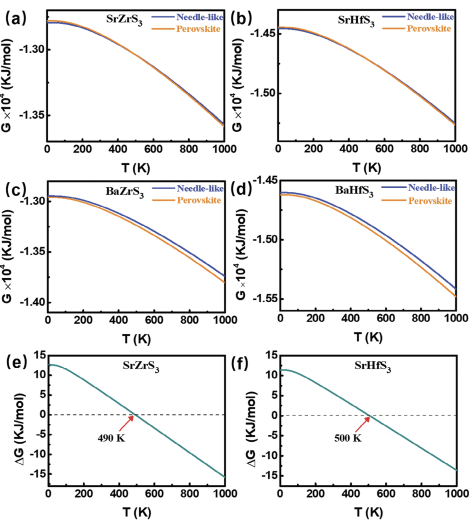 图1、计算得到针状(蓝色)和扭曲钙钛矿(橙色)相的吉布斯自由能与温度的关:(a)SrZrS3、(b)SrHfS3、(c)BaZrS3和(d)BaHfS3,两相之间的能量差(定义为ΔG=G(钙钛矿)−G(针状))与温度函数的关系:(e)SrZrS3和(f)SrHfS3。