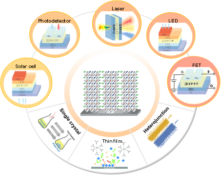 杨生春和梁超课题组以及澳门大学邢贵川合作详细介绍了近年来大n准纯相二维卤化物钙钛矿的研究进程和最新进展。作者从大n准纯相二维卤化物钙钛矿的结构入手,介绍了大n准纯相二维卤化物钙钛矿形成机制、光电子学和物理性质。重点概述了基于大n准纯相二维卤化物钙钛矿的单晶、薄膜和异质结制备方法,为打破制备技术的限制提供了新的见解。此外,还充分挖掘了大n准纯相二维卤化物钙钛矿用于太阳能电池、光电探测器、激光器、发光二极管和场效应晶体管的优势。最后,讨论了大n准纯相二维卤化物钙钛矿这种新兴光电子材料所面临的挑战和前景,并展望了该领域潜在的技术发展。