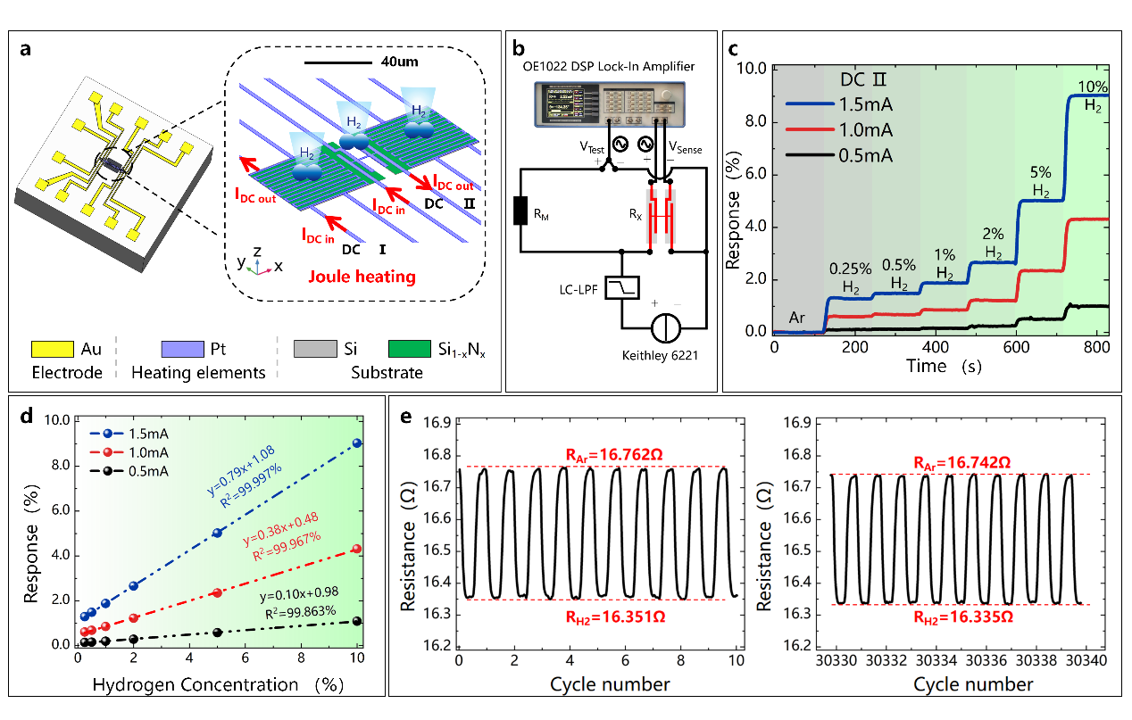 图(a)热导式氢气传感器结构原理示意图;(b)桥元件交流开尔文法测试电路图;(c)桥元件的氢气浓度响应曲线;(d)桥式元件在不同氢气浓度下的线性气体响应曲线;(e)传感器经30000次循环的长期耐受性,图示测试开始和结束时各进行的10次循环。