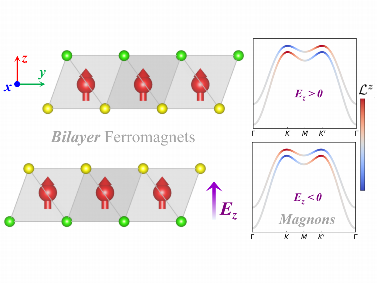 软物质与凝聚态团队姜志军特聘研究员与新加坡南洋理工大学倪斤阳博士、盐城工学院卢金炼副教授和美国阿肯色大学Laurent Bellaiche教授合作,提出了一种电场调控二维铁磁绝缘体中磁振子的通用理论框架。研究表明,在具有强自旋-层耦合的双层铁磁绝缘体中,外加电场能够有效调控层间的自旋交换相互作用,从而实现对磁振子的非易失性控制。通过密度泛函理论(DFT)计算,研究团队进一步验证了在Janus双层铬基铁磁体中,电场可精确调节两层之间的自旋交换相互作用,进而控制磁振子的拓扑性质,包括其贝里曲率和轨道磁矩。因此,相应的磁振子谷霍尔效应和轨道霍尔效应也可通过电场实现高效调控。这项工作为实现非易失自旋电子学器件迈出了重要的一步,也为未来的磁电耦合器件奠定了坚实的理论基础。
