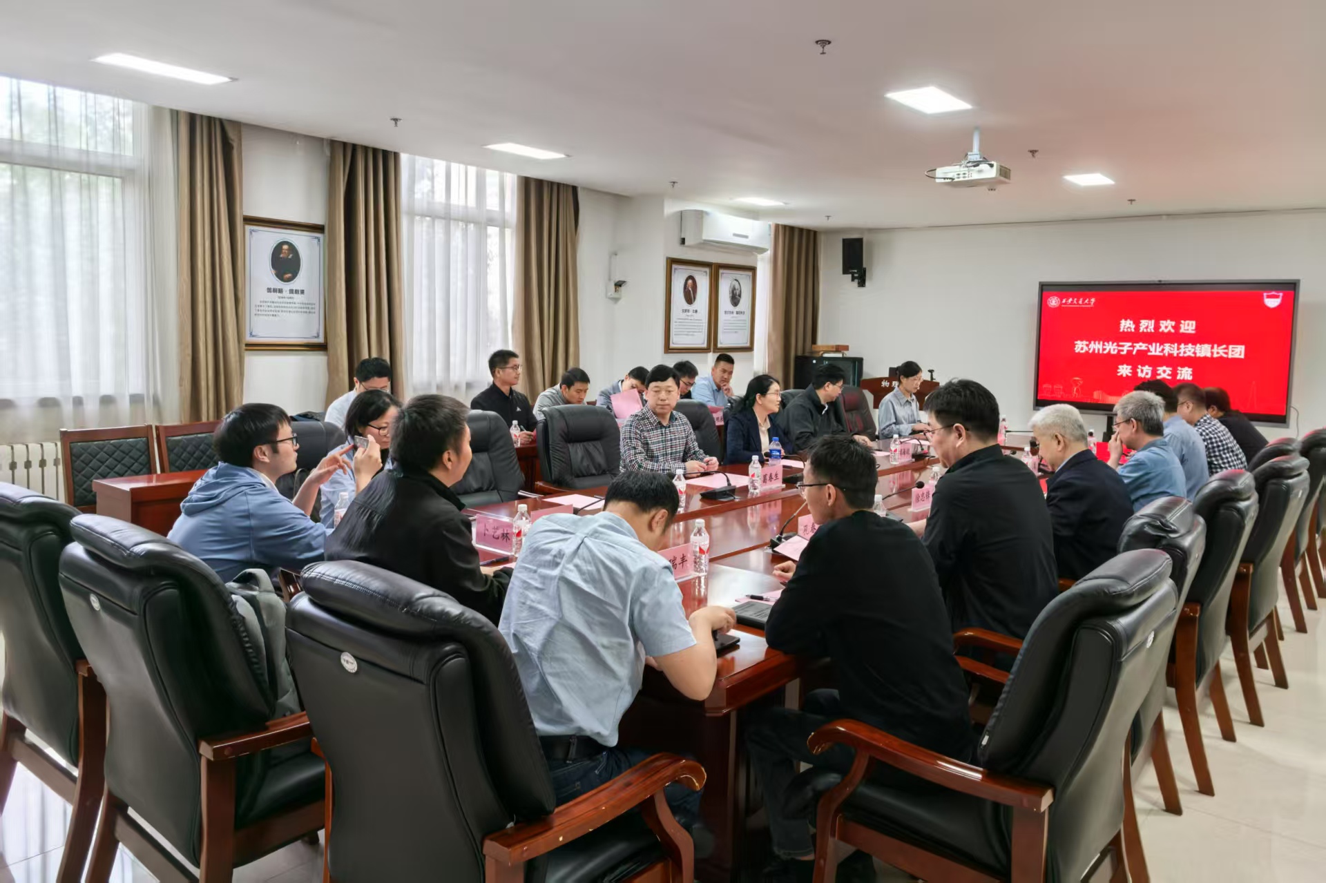 在交流环节中,双方就光学科技、产教融合、人才引育、科普宣传、技术成果转化等议题进行了深入探讨。与会教师分享最新研究成果和应用案例,镇长团成员介绍光子产业的需求和发展方向,表达了与学院开展深度合作的强烈意愿。