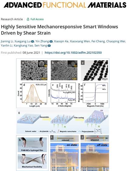 该研究工作近期以“Highly Sensitive Mechanoresponsive Smart Windows Driven by Shear Strain”为题发表在《先进功能材料》(Advanced Functional Materials)上,目前已被网易、搜狐、百度新闻、知乎等网站媒体转载报导。四虎影院