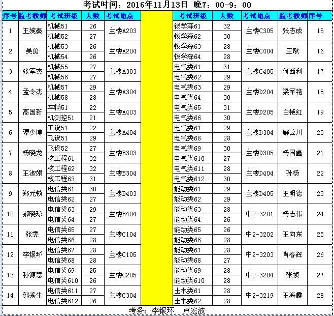 2016--2017学年第一学期"大学化学Ⅰ"期中考试安排