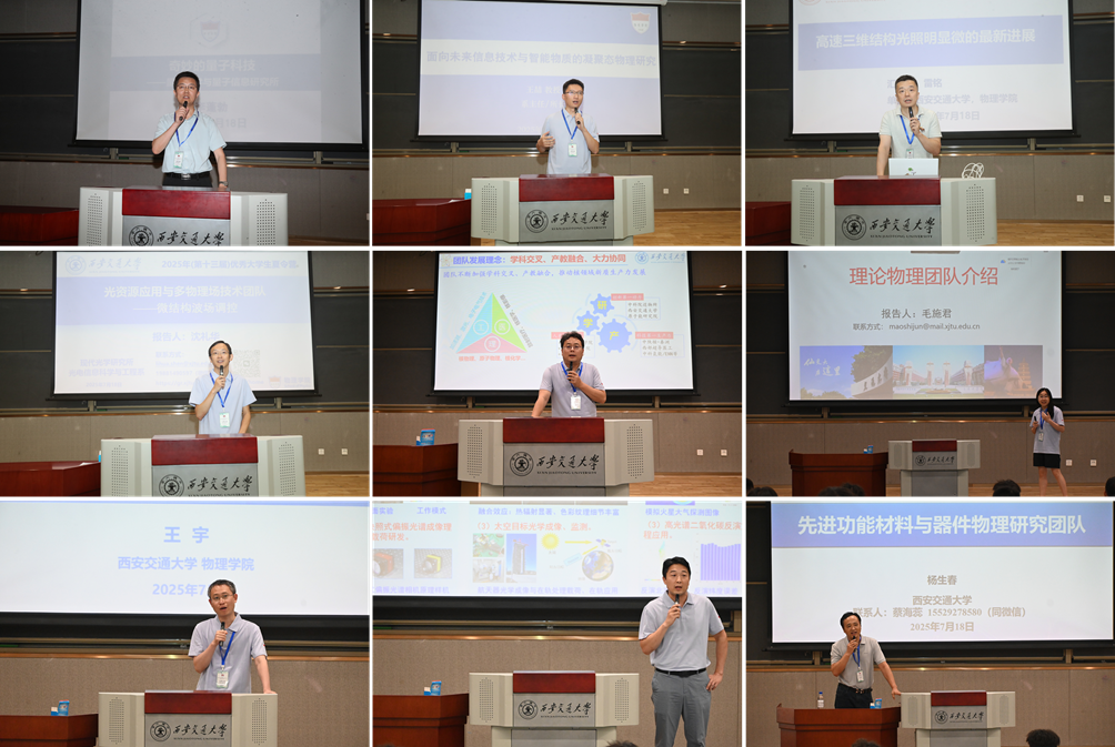 九大研究团队依次进行主题宣讲,量子光学与量子信息团队李蓬勃教授、生物物理与凝聚态物理团队王喆教授、成像光学团队雷铭教授、光资源应用与多物理场技术团队沈礼华教授、激光与粒子束科学技术团队赵永涛教授、理论物理团队毛施君教授、智能材料与传感团队王宇教授、空间光学与天文物理团队穆廷魁教授以及先进功能材料与器件物理团队杨生春教授从研究背景、核心项目、团队特色及未来发展规划等方面作了全面介绍,并与营员开展现场问答,增进了师生双向了解。