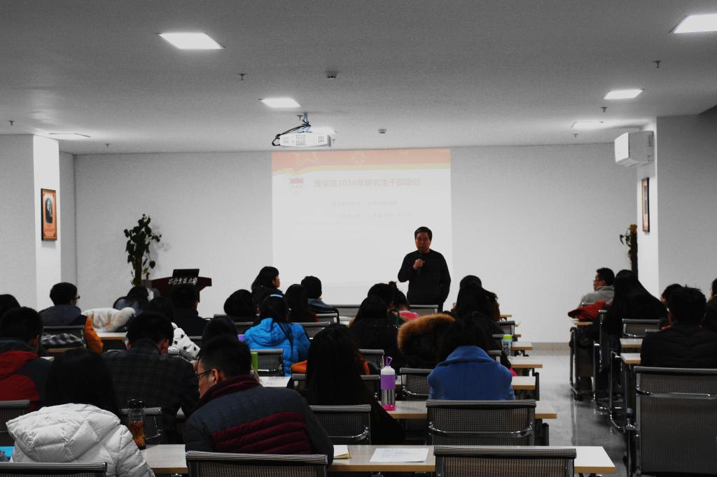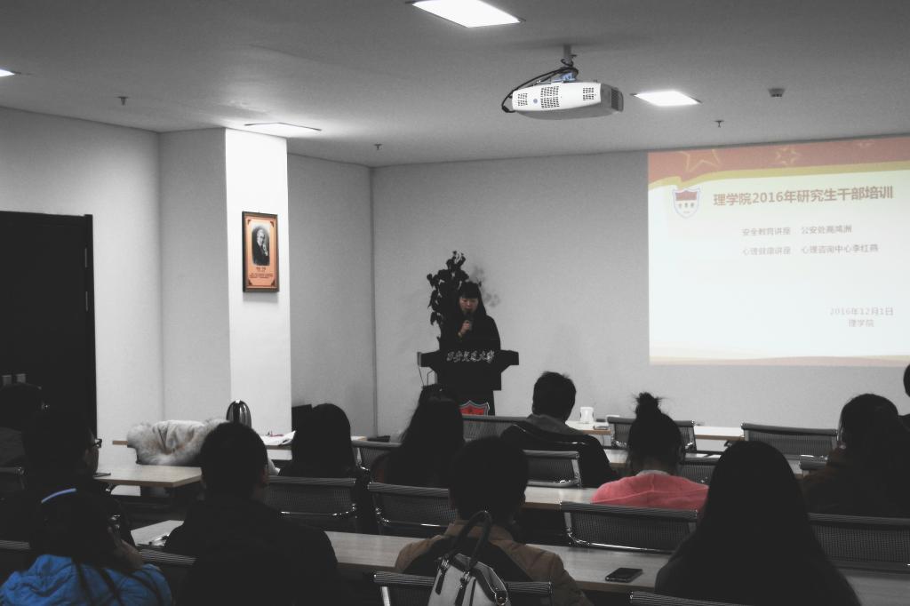 为了更好的开展理学院的学生工作,培养学生干部团队协作能力,提高学生干部工作服务水平,12月1日晚七点,学院邀请公安处治安大队队长高鸿洲、心理咨询中心李红燕为研究生干部分别进行了安全教育和心理健康教育讲座。理学院党委书记郑元锁、党委副书记张莹以及研会学生干部、各班级干部共同参加了此次研究生干部培训会,会议由魏小平老师主持。