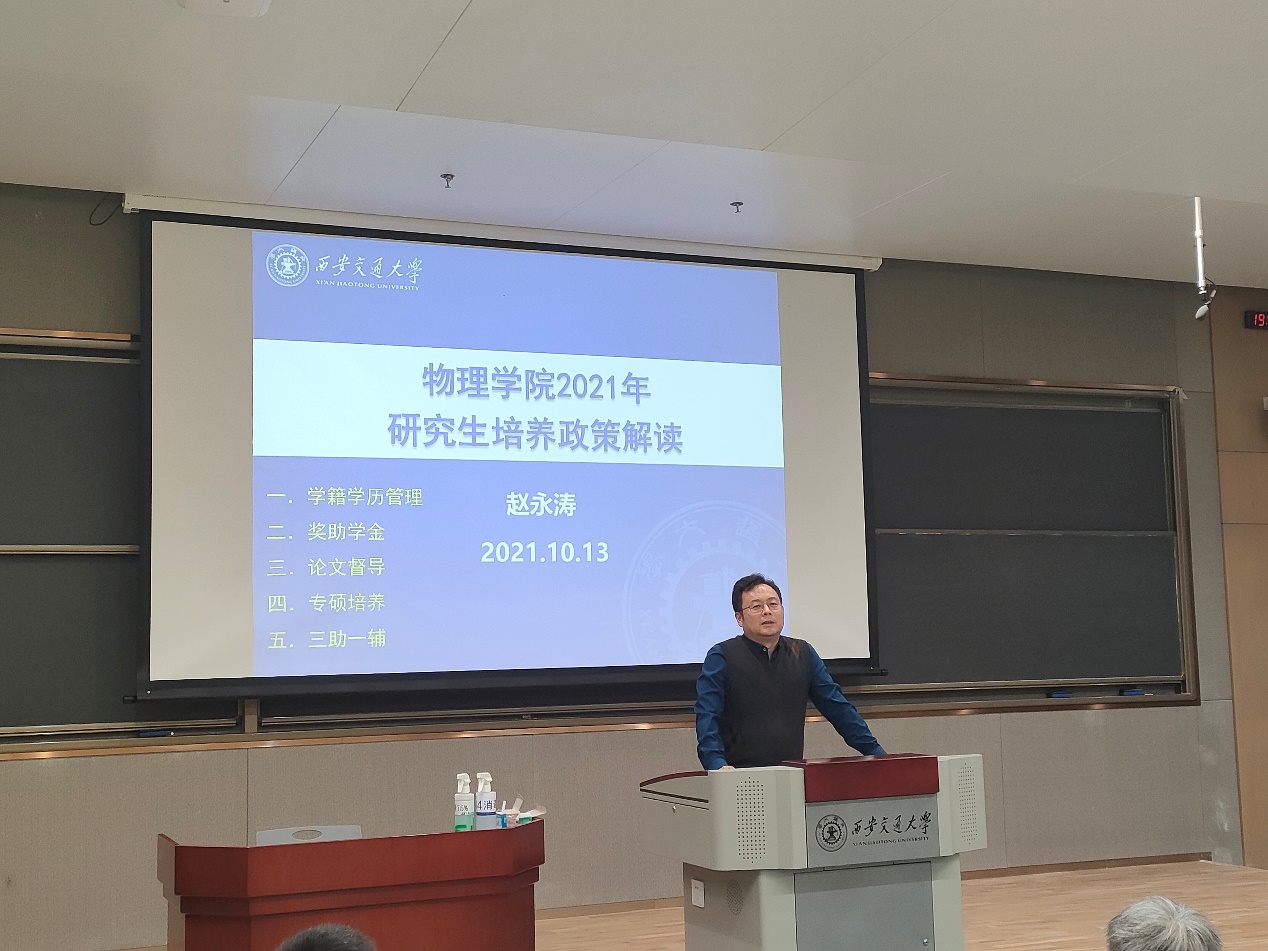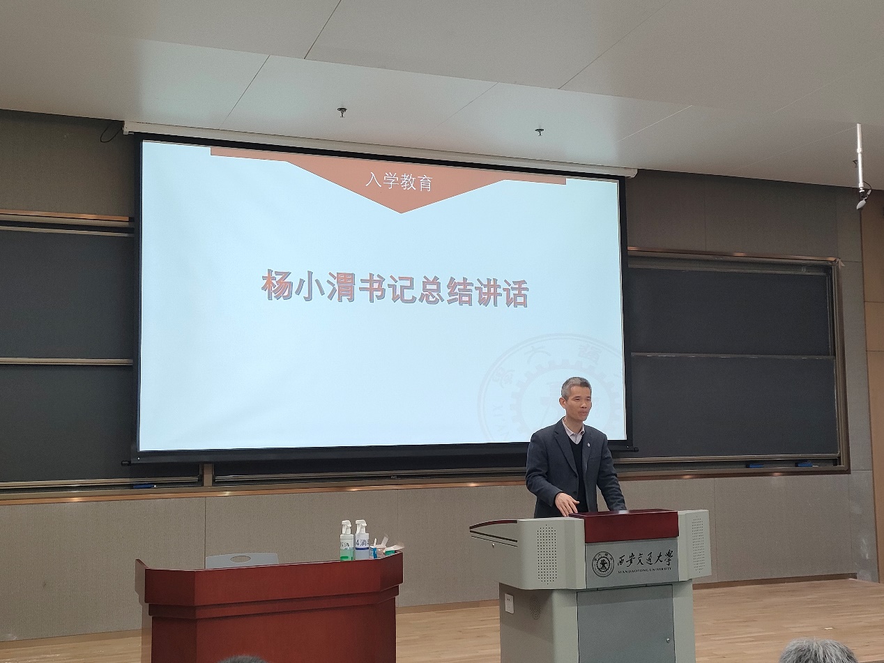 赵永涛副院长向同学们解读了研究生培养政策,对研究生学籍学历管理规定、奖助学金、专硕培养、三助一辅、论文督导等进行了详细解读,尤其强调了研究生学位论文质量保障工作实施细则。张沛副书记从政治、宿舍、实验室、财产和疾病安全五个方面展开,强调了同学们应提高安全意识,注重身心健康。最后杨小渭书记在总结讲话中鼓励同学们要注重全面发展,新起点树立新目标,奋勇争先传承西迁精神,增强新时代青年的志气、骨气、底气。